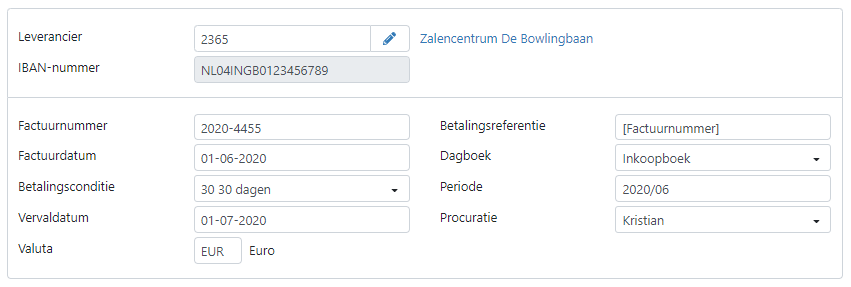 Vervolgens kun je de rest van de factuurgegevens controleren en indien nodig aanpassen in de betreffende velden (factuurnumer, factuurdatum, etc.). Hieronder een aantal links naar handige functies bij het controleren van de factuurgegevens: